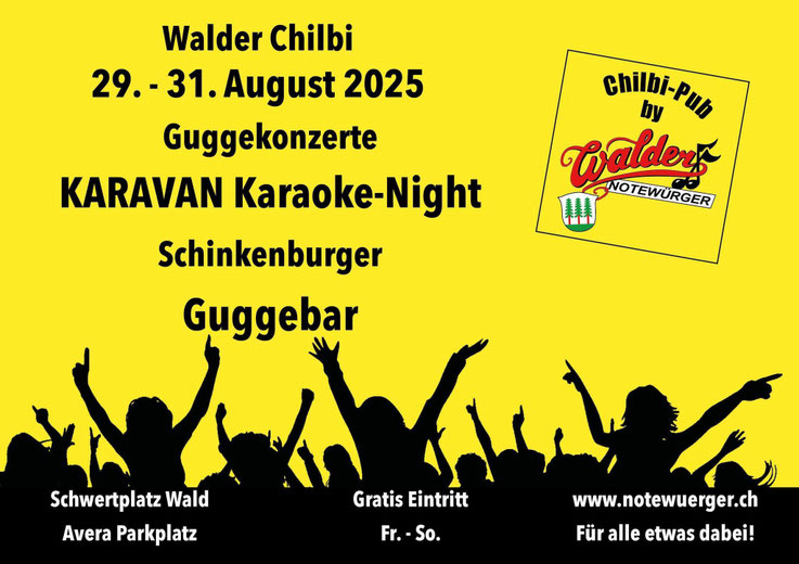 Bald ist es wieder soweit. Die Walder Chilbi 2025 steht vor der Tür. Vom 29-31. August sind wir mit unserem Zelt auf dem Avera Parkplatz anzutreffen. wir würden uns freuen euch dort begrüssen zu dürfen.